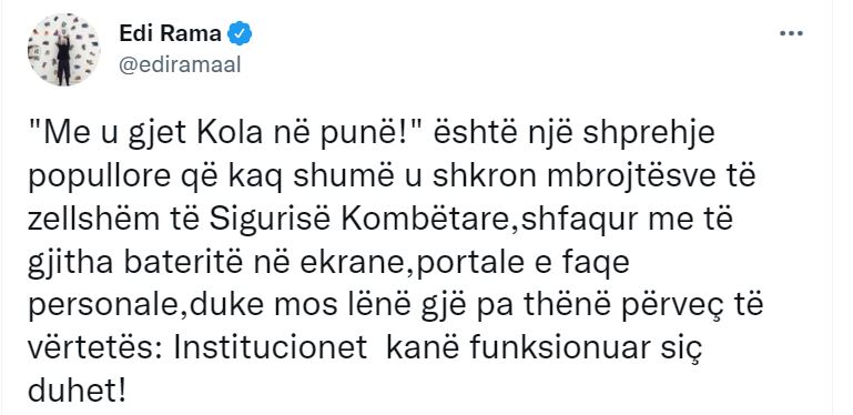 “Me u gjet Kola në punë!” është një shprehje popullore që kaq shumë u shkron mbrojtësve të zellshëm të Sigurisë Kombëtare, shfaqur me të gjitha bateritë në ekrane, portale e faqe personale,duke mos lënë gjë pa thënë përveç të vërtetës: Institucionet kanë funksionuar siç duhet!”