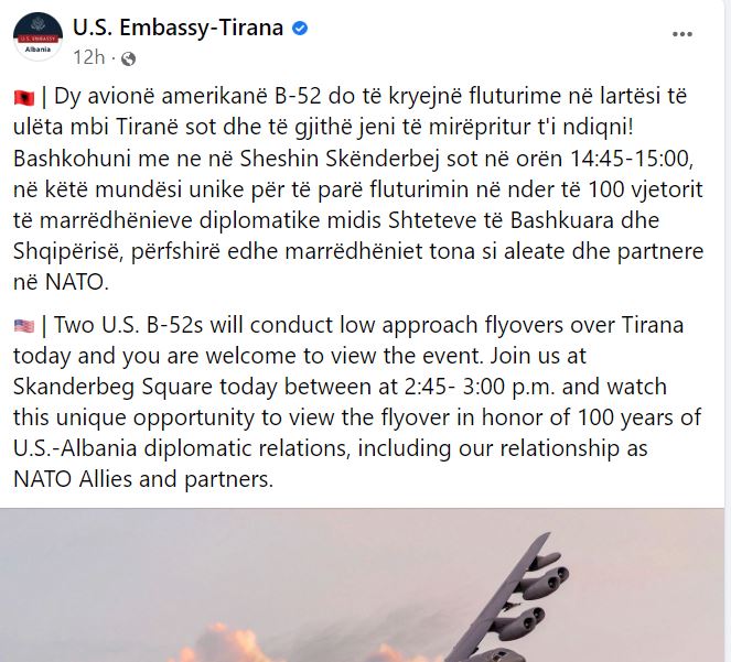 “Dy avionë amerikanë B-52 do të kryejnë fluturime në lartësi të ulëta mbi Tiranë sot dhe të gjithë jeni të mirëpritur t’i ndiqni! Bashkohuni me ne në Sheshin Skënderbej sot në orën 14:45-15:00, në këtë mundësi unike për të parë fluturimin në nder të 100 vjetorit të marrëdhënieve diplomatike midis Shteteve të Bashkuara dhe Shqipërisë, përfshirë edhe marrëdhëniet tona si aleate dhe partnere në NATO.” – shkruhet në postimin e ambasadës amerikane në Tiranë.
