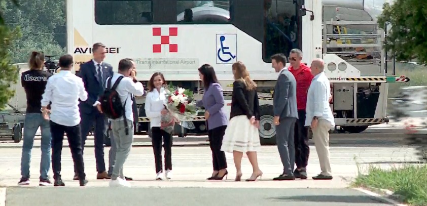 Ajo u prit në aeroportin e Rinasit nga Ministrja e Arsimit dhe Sportit Evis Kushi dhe nga presidenti i KOKSH, Fidel Ylli.