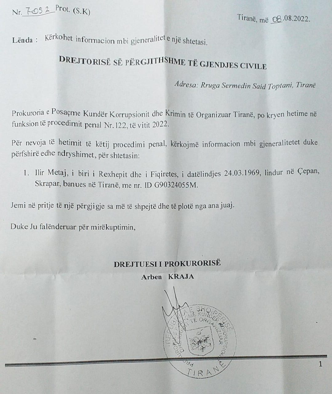 Në shkresën e mëposhtme, SPAK kërkon informacione mbi gjeneralitetet e Metës.