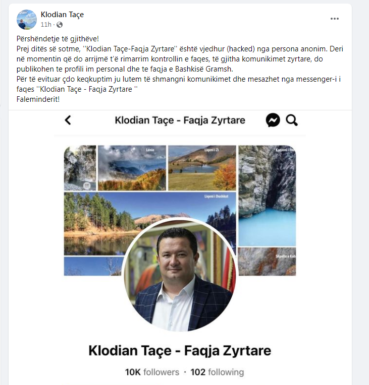 Prej ditës së sotme, ‘Klodian Taçe-Faqja Zyrtare’ është vjedhur (hacked) nga persona anonim. Deri në momentin që do arrijmë të rimarrim kontrollin e faqes, të gjitha komunikimet zyrtare, do publikohen te profili im personal dhe te faqja e Bashkisë Gramsh. Për të evituar çdo keqkuptim ju lutem të shmangni komunikimet dhe mesazhet nga messenger-i i faqes ‘Klodian Taçe – Faqja Zyrtare’.”– shkruan kryebashkiaku Taçe.