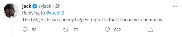 “Çështja më e madhe dhe keqardhja ime më e madhe është që u bë një kompani.”– shkroi Dorsey të enjten në një postim ku i përgjigjej një pyetjeje nëse Twitter i doli ashtu siç e kishte parashikuar.