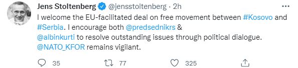 ”E mirëpres marrëveshjen e lehtësuar nga BE-ja për lëvizjen e lirë ndërmjet Kosovës dhe Serbisë. Unë i inkurajoj të dy (presidentin serb, Aleksandar Vuçiç dhe kryeministrin e Kosovës Albin Kurti) për të zgjidhur çështjet e pazgjidhura përmes dialogut politik. @NATO_KFOR mbesin vigjilentë.”- shkruan Stoltenberg.