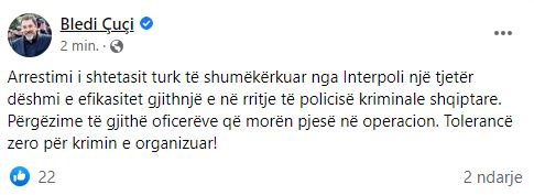 “Arrestimi i shtetasit turk të shumëkërkuar nga Interpoli një tjetër dëshmi e efikasitet gjithnjë e në rritje të policisë kriminale shqiptare. Përgëzime të gjithë oficerëve që morën pjesë në operacion. Tolerancë zero për krimin e organizuar!”- shkruan ministri.