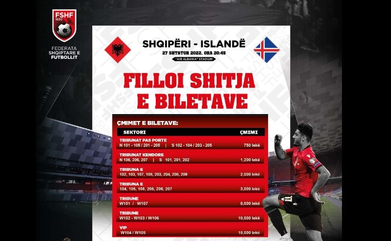 Federata Shqiptare e Futbolllit ka publikuar këtë të martë çmimet e biletave për ndeshjen mes Shqipërisë dhe Islandës, që luhet më 27 shtator në orën 20:45, në stadiumin “AIR Albania”.
