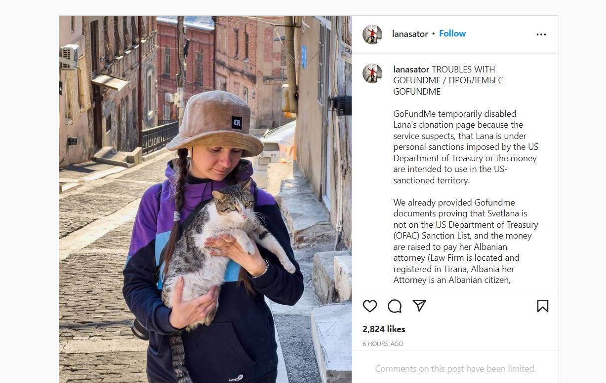 Ata shkruajnë në faqen Lanasator në Instagram se Gofundme dyshon se Timofoeva është nën sanksione personale nga Departamenti i Thesarit në SHBA ose se paratë synohen të përdoren në territorin e sanksionuar nga SHBA-ja.