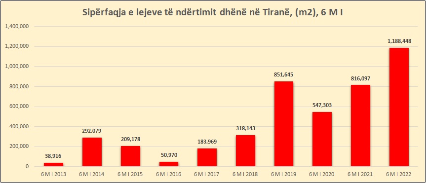 Sipas të dhënave të INSTAT, në kryeqytet, për periudhën janar- qershor 2022 është dhënë një sipërfaqe prej gati 1.2 milionë metra katror, me një rritje prej 45% në krahasim me të njëjtën periudhë të një viti më parë.