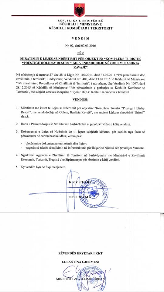 “Pretendimi i mediave të zotit Irfan Hysenbelliu se ndërhyrja e sotme e IKMT është e paligjshme pasi resorti paska leje të miratuar është një tjetër manipulim i opinionit publik. Dokumenti i nxjerrë në mediat në fjalë me firmën e kryeministrit Edi Rama si kryetar i KKT provon të kundërtën e pretendimit. Leja është një leje me kusht, ku thuhet qartësisht se dokumenti i lejes së ndërtimit do të jepet vetëm pasi tē plotësohet dokumentacioni tekniko-ligjor dhe të paguhen taksat përkatëse. Asnjëri nga kushtet nuk është plotësuar dhe sot zoti Irfan Hysenbelliu i detyrohet shtetit dhe qytetarëve kthimin e sipërfaqeve të zaptuara si edhe borxhin financiar nga mospagimi i taksave.” – thuhet në reagim.