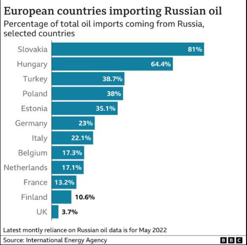(Sanksionet përmbajnë përjashtime për naftën e importuar nëpërmjet tubacioneve për vendet e BE-së të varura prej tyre, si Sllovakia, Hungaria, Republika Çeke, Bullgaria dhe Kroacia).
