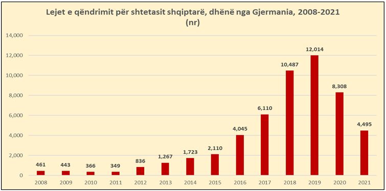 Në total, që nga viti 2008 deri në 2021-n, Gjermania ka dhënë rreth 53 mijë leje qëndrimi për shtatsit shqiptarë, ose 7% të totalit nga shtetet e BE-së, duke u renditur e treta. Në vend të parë renditet Italia, që ka dhënë 372 mijë lejë qëndrimi gjithsej, ose rreth 48% të totalit. Greqia vijon më pas me 258 mijë leje, ose 33% të totalit.