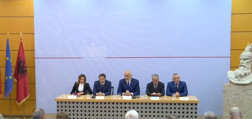 Në Ministrinë e Brendshme, kryeministri Edi Rama po bën prezantimin e Drejtorit të ri të Përgjithshëm të Policisë së Shtetit Muhamet Rrumbullakut, si dhe drejtuesve të rinj të Agjencisë së Mbikëqyrjes Policore e të Inspektoriatit Kombëtar të Mbrojtjes së Territorit.