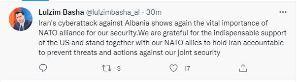 “Sulmi kibernetik i Iranit kundër Shqipërisë dëshmon sërisht rëndësinë jetike që ka Aleanca e NATO’s për sigurinë tonë. Ne u jemi mirënjohës SHBA për mbështetjen e pazëvendësueshme dhe qëndrojmë krah për krah aleatëve tanë në NATO për ta mbajtur Iranin përgjegjës dhe për të parandaluar kërcënimet dhe aktet kundër sigurisë sonë të përbashkët.”- shkruan Basha.