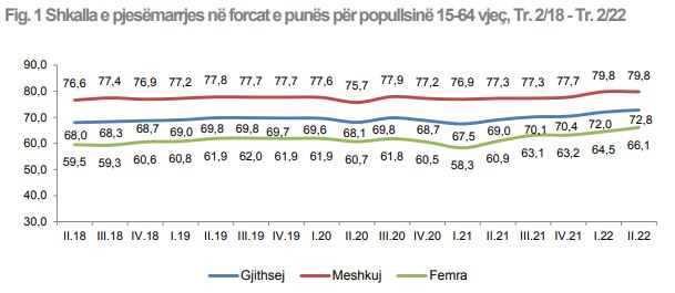 Gjatë tremujorit të dytë të vitit 2022, shkalla e pjesëmarrjes në forcat e punës për të rinjtë e moshës 15-29 vjeç është 55,3 %. Ky tregues është rritur me 3,4 pikë përqindje krahasuar me tremujorin e dytë të vitit 2021, dhe me 0,1 pikë përqindje në krahasim me tremujorin e parë 2022. Për popullsinë 30-64 vjeç, në tremujorin e dytë 2022, shkalla e pjesëmarrjes në forcat e punës është 81,2 %.
