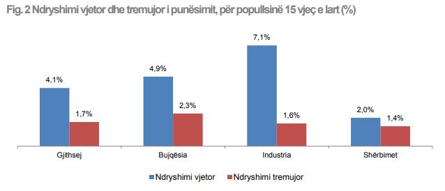 Ritmi vjetor i ndryshimit të punësimit për popullsinë 15 vjeç e lart, nga tremujori i dytë i vitit 2021 në tremujorin e dytë 2022, është +4.1 %. Në terma vjetorë, punësimi rritet me 7,1 % në sektorin e industrisë, me 2,0 % në sektorin e shërbimeve, dhe me 4,9 % në sektorin e bujqësisë.
