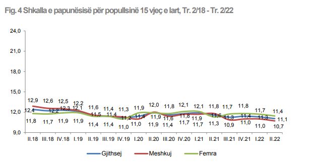Shkalla zyrtare e papunësisë për burrat është 10,7 % dhe për gratë 11,4 %. Krahasuar me të njëjtin tremujor të vitit 2021, shkalla e papunësisë është ulur me 1,1 pikë përqindje për burrat dhe është rritur me 0,1 pikë përqindje për gratë.