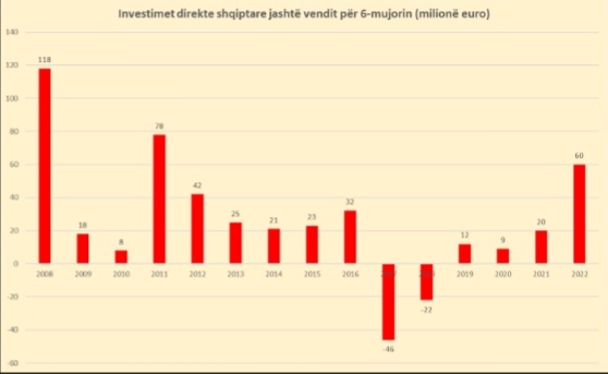 Sipas të dhënave nga Banka e Shqipërisë, për 6-mujorin 2022, vlera e investimeve të kompanive shqiptare jashtë vendit arriti në 60 milionë euro, tre herë më shumë krahasuar me të njëjtën periudhë të një viti më parë. Ky është njëkohësisht edhe niveli më i lartë qysh prej vitit 2011. Në pjesën dërrmuese, investimet shqiptare janë kanalizuar në kontribute direkte në kapitalin e shoqërive të kontrolluara jashtë vendit, ndërsa një pjesë më e vogël ka shkuar në formën e huave të dhëna për kompanitë bija.