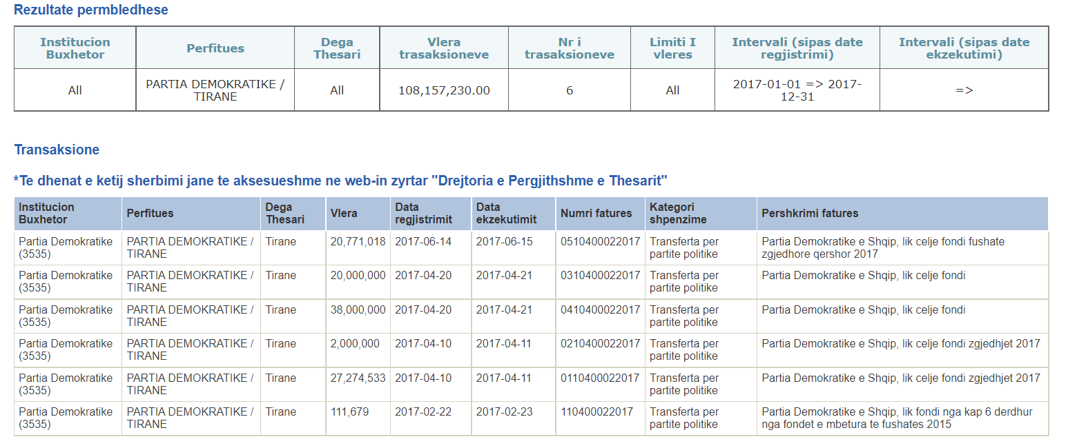 Transaksionet bankare të Partisë Demokratike janë publikuar edhe në portalin Spendin Data (shiko këtu) dhe janë lehtësisht të verifikueshme shumat e përfituara nga buxheti.