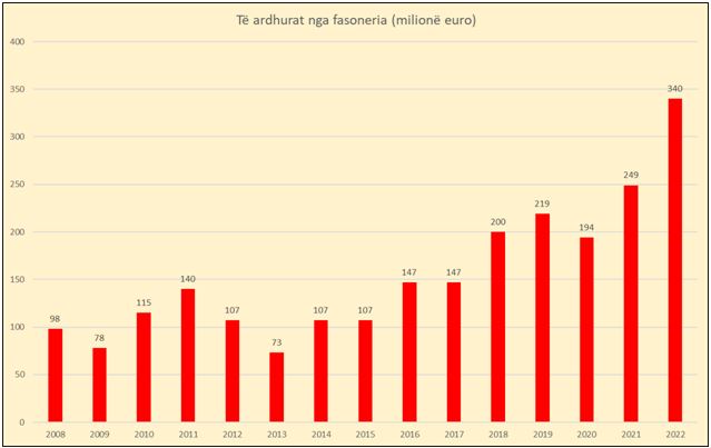 Për gjysmën e parë të këtij viti, të ardhurat nga aktivitetet e fasonerisë kanë tejkaluar madje edhe të ardhurat nga turizmi, që në terma neto, sollën një shumë lehtësisht më të ulët, 338 milionë euro. Fasoneria këtë vit është kontribuesi i dytë më i madh neto mes zërave të llogarisë korente, pas remitancave.