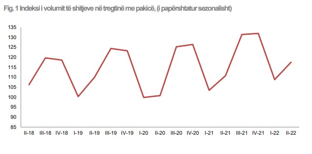 Në tremujorin e dytë 2022, indeksi i volumit të shitjeve në tregtinë me pakicë shënoi 117.5.