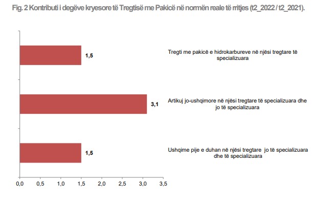 Në grupin “Ushqime, pije, duhan në njësi tregtare jo të specializuara dhe të specializuara”, volumi i shitjeve është rritur 4.8 %, krahasuar me të njëjtin tremujor të vitit 2021. Volumi i shitjeve, për grupin “Artikuj jo-ushqimorë në njësi tregtare të specializuara dhe jo të specializuara”, është rritur 7.5 %, kundrejt të njëjtës periudhë të vitit paraardhës. Në grupin “Tregti hidrokarbure në njësi tregtare të specializuara”, volumi i shitjeve është rritur me 5.2 %, krahasuar me të njëjtin tremujor të vitit 2021.