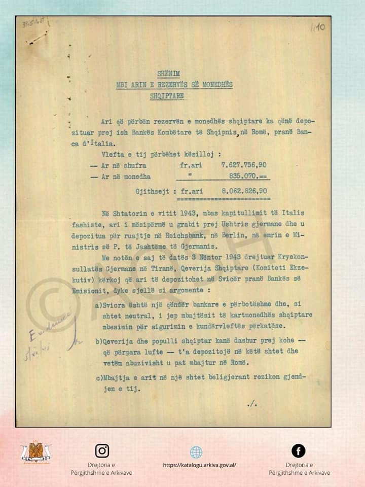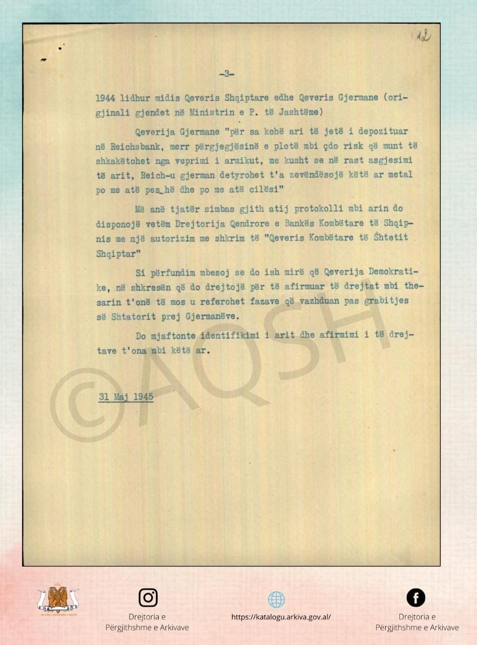 Më 6 prill 1944 ari u depozitua për ruajtje pranë “Rajh Bank”-ut në Berlin vetëm në emër të Bankës Kombëtare. Protokolli u lidh mes qeverisë shqiptare dhe ajo gjermane nënshkruan një protokoll, ku përcaktoheshin përgjegjësitë e palëve nënshkruese.”- thotë Drejtoria e Arkivave.