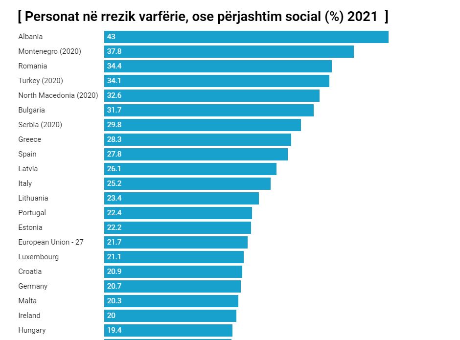 Pas Shqipërisë, nivelin më të lartë të personave në rrezik varfërie dhe përjashtim social e ka mali i Zi, me 38%, i ndjekur nga Rumania me 34.4%, Turqia 34%, Maqedonia e Veriut 32.6, Bullgaria 31.7, Serbia 29.8.