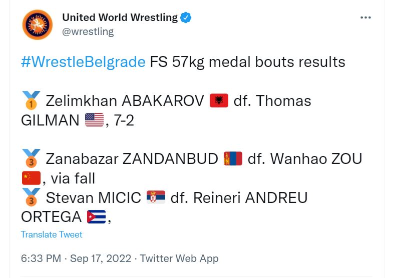 Mundësi rus me origjinë çeçene i natyralizuar si shqiptar Zelimkhan Abakarov i ka dhënë Shqipërisë medaljen e artë në Botërorin e Mundjes që po zhvillohet në kryeqytetin serb, Beograd.