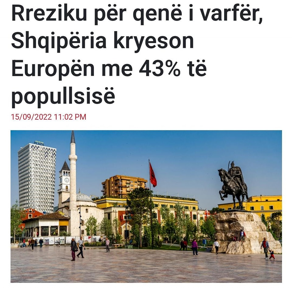 “Shqipëria, sipas Agjencisë Europiane të Statistikave, kryeson në kontinent me 43% të popullsisë së saj të rrezikuar seriozisht nga varfëria dhe përjashtimi social. Situata është edhe më e rëndë nëse i referohemi faktit se aktualisht 67% e shqiptarëve jetojnë sot me të ardhura nën dhe deri në 5.5 dollarë në ditë. Laku i varfërisë shtrëngohet çdo ditë dhe më shumë nga rritja abuzive dhe e pandalshme e çmimeve, si dhe nga mungesa e paketave sociale efektive të ndihmës për çdo kategori në nevojë. Rilindja po i zhyt thellë dhe më thellë shqiptarët në pasiguri dhe varfëri, sepse qëllimi i saj është vetëm vjedhja papushim e taksave të tyre për veten, klientët dhe oligarkët e saj. Ndërkohë që sipas Eurostat, 43% e popullsisë rrezikohet nga varfëria, Edi Rama paguan çdo ditë 80.000 euro pronarët në arrati të inceneratorëve fiktivë, ‘kryeveprën’ e aferës së tij korruptive.
