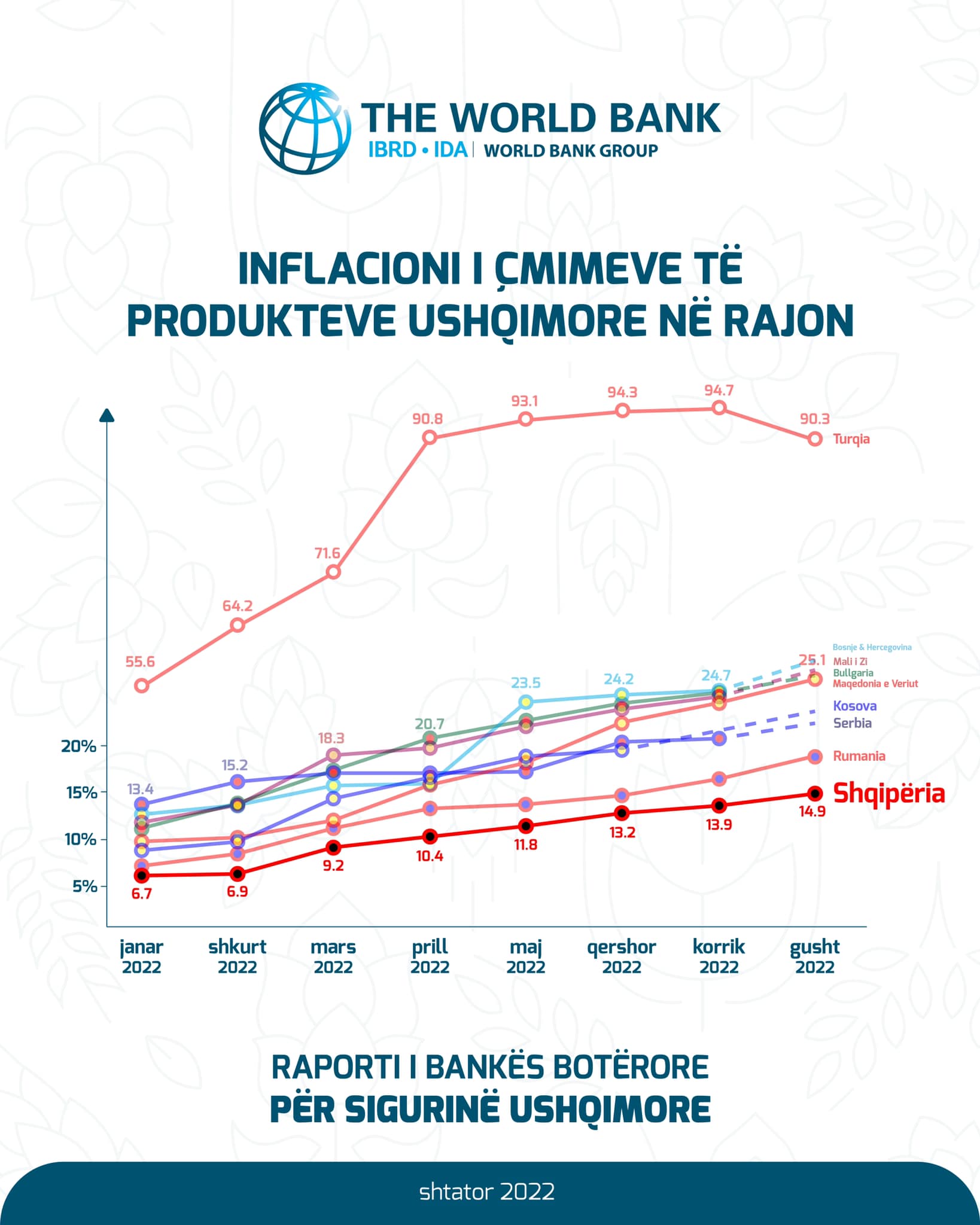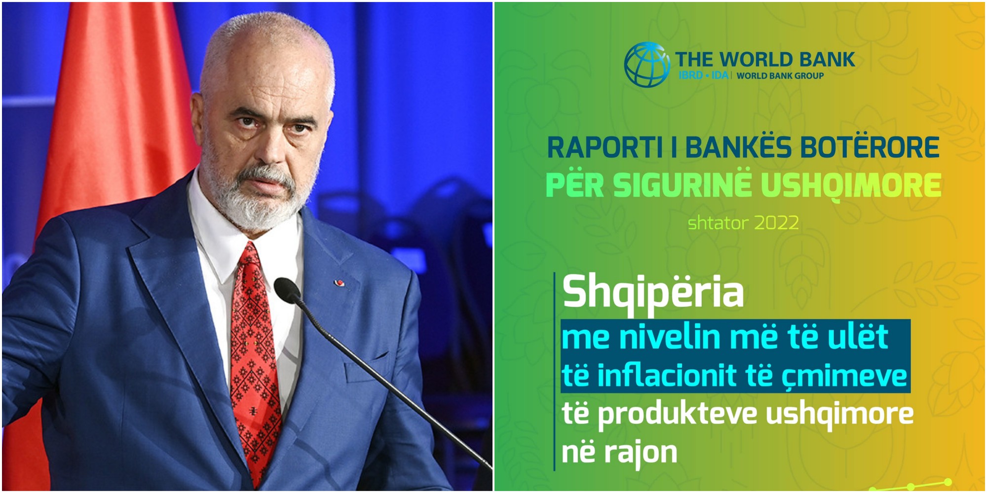 “Sipas raportit të shtatorit të Bankës Botërore për Sigurinë Ushqimore, në analizën e efekteve të luftës mbi çmimet në produktet ushqimore dhe gjendjen e prodhimit/furnizimit, Shqipëria rezulton me nivelin e inflacionit më të ulët mbi çmimet e produkteve ushqimore, krahasuar me vendet e rajonit. Rritja e çmimeve në Shqipëri është thuajse sa gjysma e rritjes së raportuar në pothuaj të gjithë vendet e rajonit. Arsyeja themelore e frenimit të galopit të inflacionit në vendin tonë është mburoja financiare e qeverisë mbi çmimin e energjisë, i cili mbahet i paprekur nga rritja si rezultat i kompensimit masiv nga buxheti i shtetit”, shkruan Rama krahas raportit.