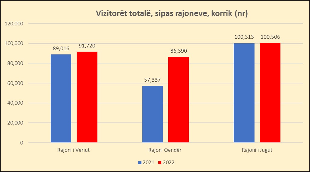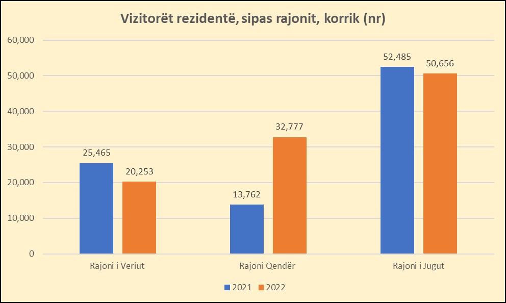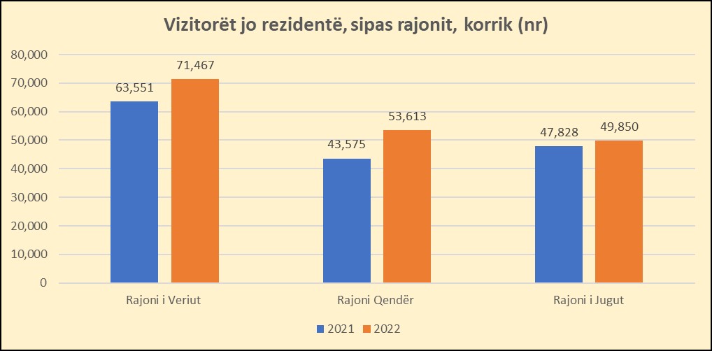 Edhe në Veri numri i turistëve jo-rezidentë ka qenë ë i lartë këtë korrik sipas të dhënave të strukturave akomoduese ku rritja e raportuar është 12.4 për qind. Në Jug numri i të huajve në korrik 2022 ishte 4.2 për qind më i lartë se korriku i një viti më parë.
