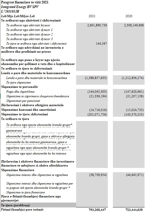 Sipas të dhënave zyrtare nga bilanci, kompania Integrated Energy BV SPV ka raportuar të ardhura në vlerën e 2.6 miliardë lekëve në vitin financiar 2021 (22 milionë euro), ndërsa fitimi para taksave ishte 793 milionë lekë (rreth 6.2 milionë euro).