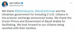 Këshilltari i Sigurisë Kombëtare i SHBA-së, Jake Sullivan, gjithashtu e falenderoi princin e kurorës saudit për ndihmën e dhënë në lirimin e dy amerikanëve.