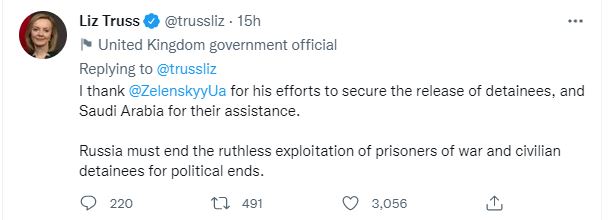 Kryeministrja e Mbretërisë së Bashkuar Liz Truss gjithashtu shkroi në Twitter: “Falënderoj presidentin Zelensky për përpjekjet e tij për të siguruar lirimin e të arrestuarve dhe Arabinë Saudite për ndihmën e tyre. Rusia duhet t’i japë fund shfrytëzimit të pamëshirshëm të të burgosurve të luftës dhe të të burgosurve civilë për qëllime politike.”