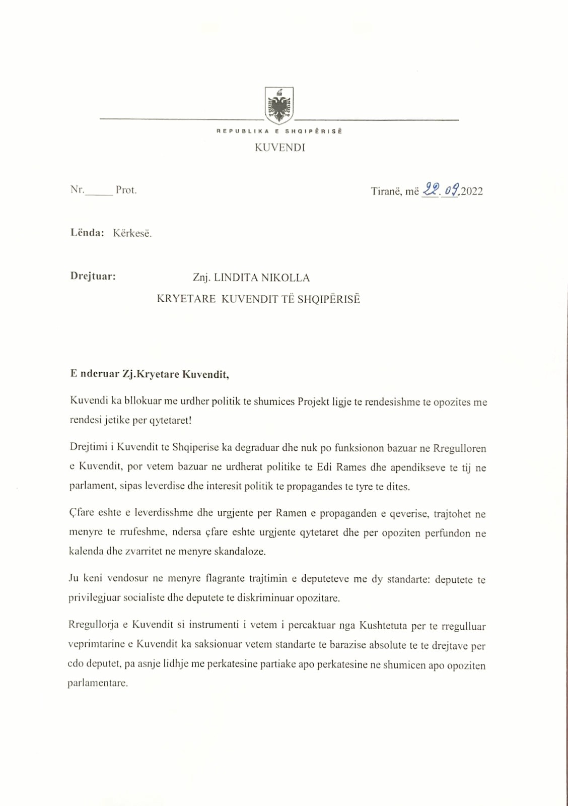 I jam drejtuar sot Kryetares së Kuvendit Nikolla zyrtarisht për të vendosur Kuvendin e Shqipërisë në shinat e ligjit.