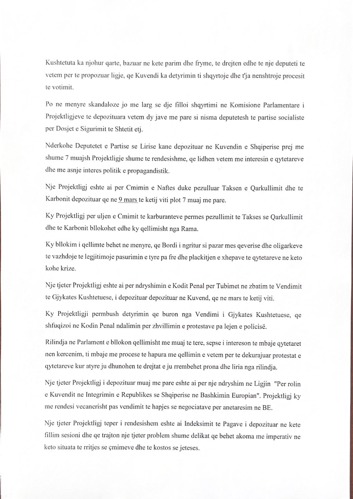 Përmes kësaj shkrese, Vasili i kërkon Nikollës të vendosë Kuvendin në shinat e ligjit, pasi sipas tij projektligjet e opozitës bllokohen e zvarriten duke shkelur në rregulloren.