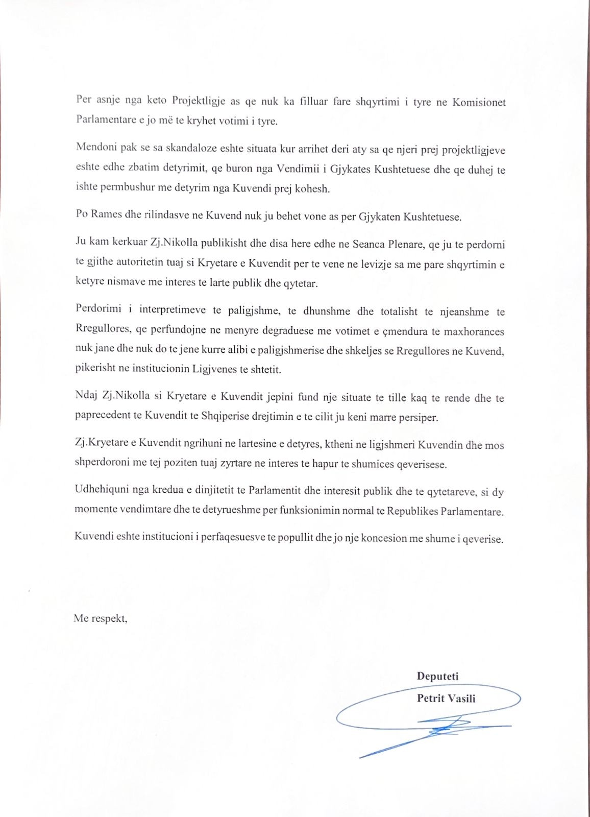 Deputeti i Partisë së Lirisë Petrit Vasili i është drejtuar sot me një letër kryetares së Parlamentit, zonjës Lindita Nikolla.