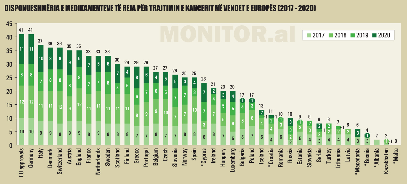 Shoqata e Farmacistëve shpjegoi se, këto medikamente nuk janë të përfshira në listën e rimbursimit, prandaj pacientët nuk kanë akses, pasi shumica e tyre e kanë të pamundur të përballojnë trajtime të kushtueshme prej mijëra eurosh. Gjermania ishte vendi me aksesin më të lartë të terapive të reja kundër kancerit, duke përfshirë në listën e rimbursimit 41 medikamenteve të reja, më pas Italia, me 37 medikamente të përfshira në listë etj.