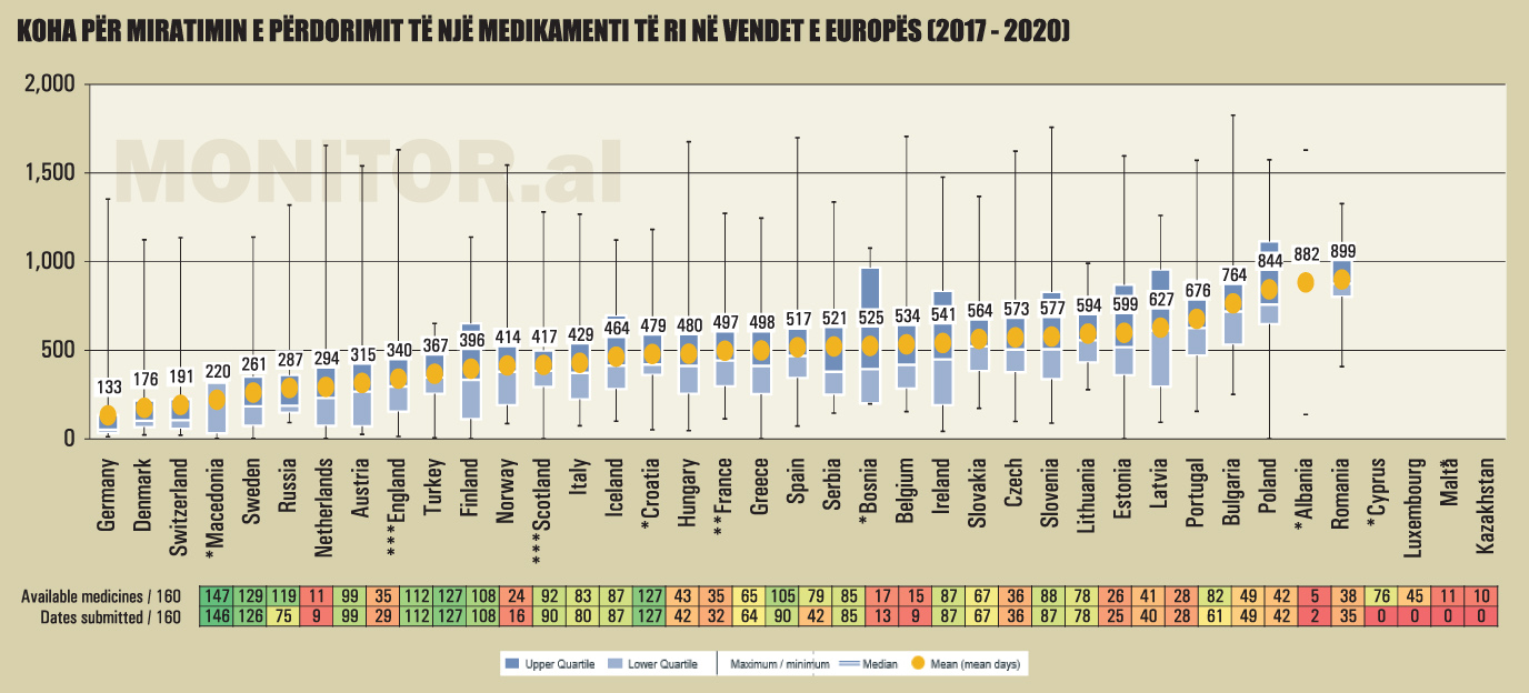 Nga 39 vendet europiane në studim, Shqipëria lë pas vetëm Rumaninë me 899 ditë. Të dhënat tregojnë se vendet e zhvilluara të Europës kanë një fleksibilitet të lartë të aksesit të barnave të reja në tregje. P.sh., Gjermanisë i duhen vetëm 133 ditë që të vërë në dispozicion të qytetarëve të saj një terapi të re mjekimi, Danimarkës 176 ditë.