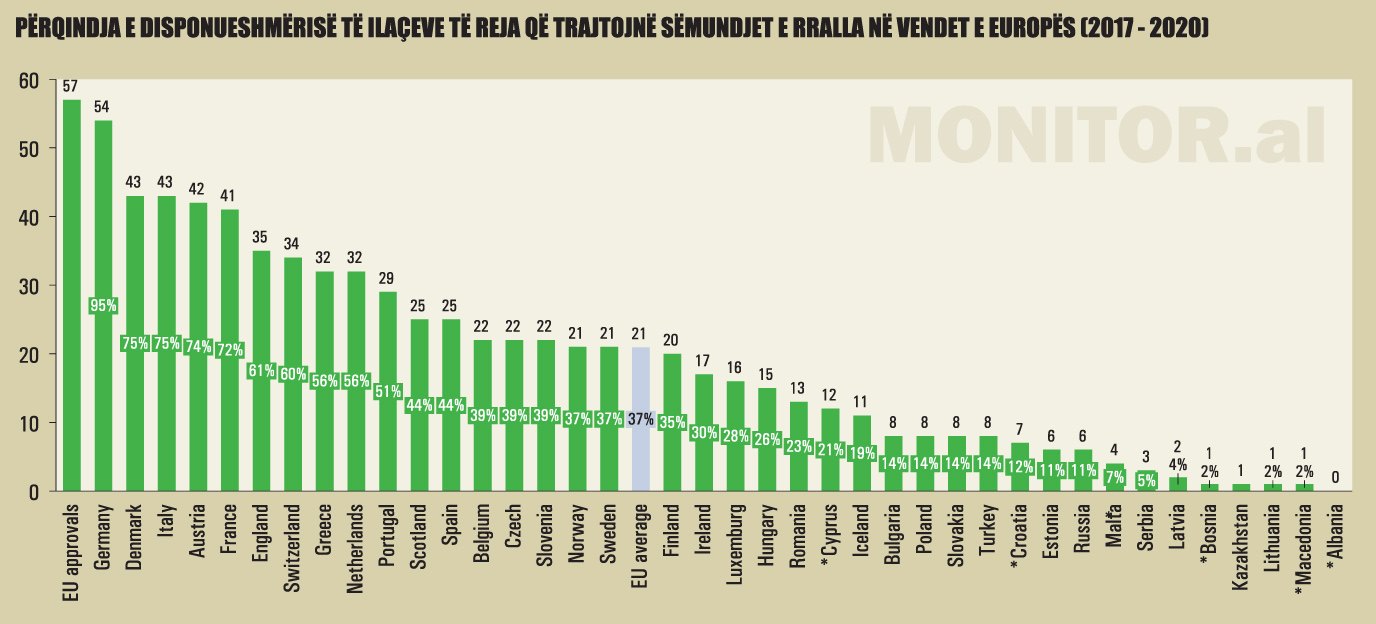 Vetëm gjatë periudhës 2017-2020, BE autorizoi edhe 57 medikamente që trajtojnë sëmundjet e rralla. Vendet e zhvilluara, por edhe ato të rajonit, kanë përfshirë në listat e rimbursimit disa nga këto medikamente, sipas kapacitetit financiar, ndërsa Shqipëria nuk ka përfshirë asnjë nga këto medikamente.