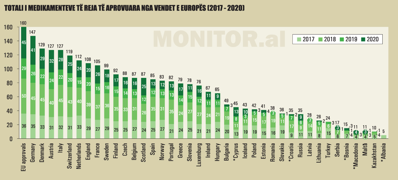 Një studim i fundit i IQVIA (kompani shumëkombëshe që u shërben industrive të kombinuara të teknologjisë së informacionit shëndetësor dhe kërkimit klinik) gjeti se Shqipëria ka praninë më të ulët të medikamenteve të reja, me një diferencë shumë të madhe me fqinjët si Maqedonia e Veriut, Serbia, të cilat kanë miratuar përkatësisht 11 dhe 17 medikamente të reja secila.