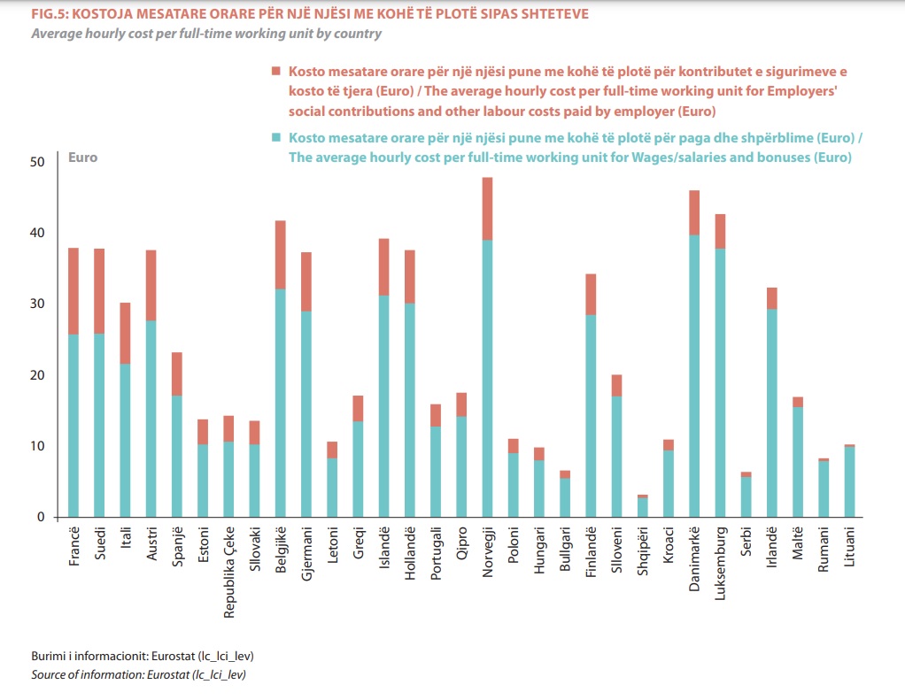 Më pas renditen shtete si Serbia dhe Bullgaria me kosto orare mesatare për njësi pune me kohë të plotë përkatësisht 6,2 dhe 6,5 euro.