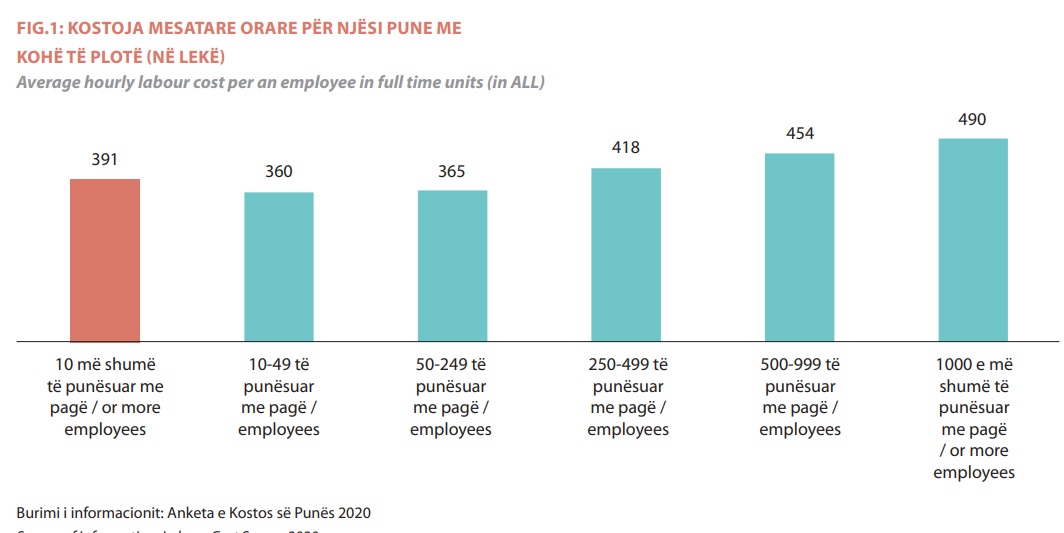 Kostoja mesatare orare për njësi pune me kohë të plotë rritet me rritjen e madhësisë së ndërmarrjes. Kostoja mesatare orare për njësi pune me kohë të plotë është më e lartë në ndërmarrjet jo-bujqësore me 1000 e më shumë të punësuar me pagë, rreth 490 lekë dhe më e ulët për ndërmarrjet jo-bujqësore me 10-49 të punësuar me pagë, rreth 360 lekë.