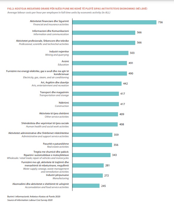 Sipas aktivitetit ekonomik, kostoja mesatare orare për njësi pune me kohë të plotë, është më e lartë në Aktivitetet Financiare dhe të Sigurimit 756 lekë dhe më e ulët në Aktivitetet e Akomodimit dhe aktivitetet e shërbimit të ushqimit 245 lekë, Industrinë përpunuese 272 lekë dhe Aktivitetet e furnizimit me ujë, aktiviteteve të trajtimit dhe menaxhimit të mbeturinave, rregullimit 281 lekë.