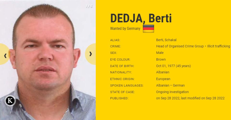 Berti Dedja, 44-vjeç, akuzohet se që nga viti 2016 ka tregtuar kokainë dhe marihuanë si pjesë e një organizate, të cilën e drejtonte vetë. Dedja fshihet që nga viti 2018 dhe sipas policisë kriminale të rajonit Baden-Württemberg, hetuesit kanë dyshime se ai mund të jetë fshehur në Belgjikë, Holandë, Itali ose Shqipëri.