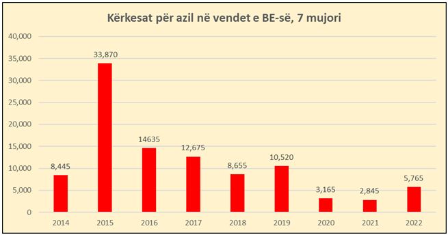Numri më i lartë i azilantëve nga Shqipëria në vendet e BE u regjistrua në vitin 2015, kur një valë masive emigracioni nisi në vend. Në periudhën janar-korrik 2015 u shënuan gati 34 mijë kërkesa ndërsa për gjithë atë vit numri iu afrua 70 mijë. Më pas ritmi ra gradualisht, ndërsa në vitin pandemik u shënua niveli më i ulët i dekadës së fundit. Megjithatë, tendenca për të ikur u rigjallërua sërish pas pandemisë.