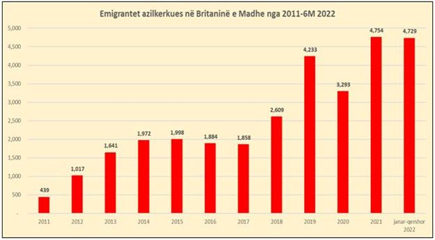 Por, të dhënat zyrtare të Autoriteteve Britanike tregojnë se rreth 4729 shqiptarë kanë hyrë në mënyrë të paligjshme në vendin e tyre dhe janë regjistruar si azilkërkues gjatë periudhës janar-qershor 2022, një shifër që është sa 80% e të gjithë kërkesave për azil në 27 shtetet e tjera të Bashkimit Europian, duke e çuar në total shifrën e aplikimeve në mbi 10 mijë. Kërkesat për azil vetëm në 6 muajt e parë të 2022-t janë më të larta se gjithë viti 2021, kur ishte shënuar dhe numri më i lartë rekord deri tani.