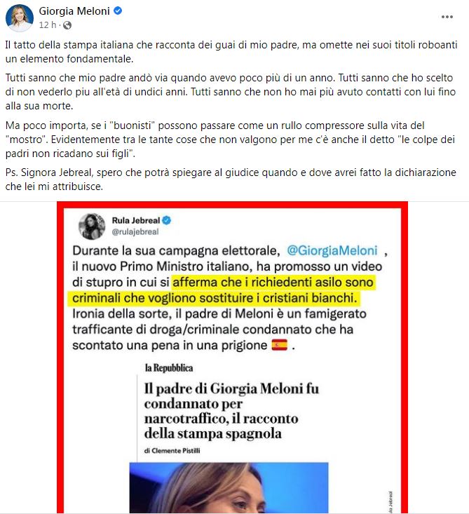 Kjo për shkak të një postimi të gazetares së “La Repubblica”, Rula Jebreal për shpifje. Kjo pasi gazetarja e kishte sulmuar Melonin, duke përdorur një histori të babait të saj.