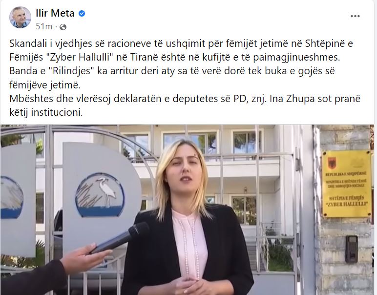 “Skandali i vjedhjes së racioneve të ushqimit për fëmijët jetimë në Shtëpinë e Fëmijës “Zyber Hallulli” në Tiranë është në kufijtë e të paimagjinueshmes. Banda e “Rilindjes” ka arritur deri aty sa të verë dorë tek buka e gojës së fëmijëve jetimë. Mbështes dhe vlerësoj deklaratën e deputetes së PD, znj. Ina Zhupa sot pranë këtij institucioni.” – shkruan Meta.