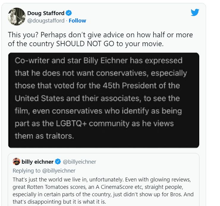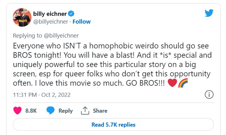 Sipas profilit të Imdb.com për ‘Bros’, Eichner ‘është shprehur se ai nuk dëshiron që konservatorët, veçanërisht ata që votuan për presidentin e 45-të të Shteteve të Bashkuara Donald Trump dhe bashkëpunëtorët e tyre, ta shohin filmin, madje edhe konservatorët që identifikohen si pjesë e komunitetit LGBTQ+, pasi ai i sheh ata si tradhtarë’.