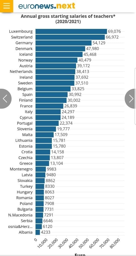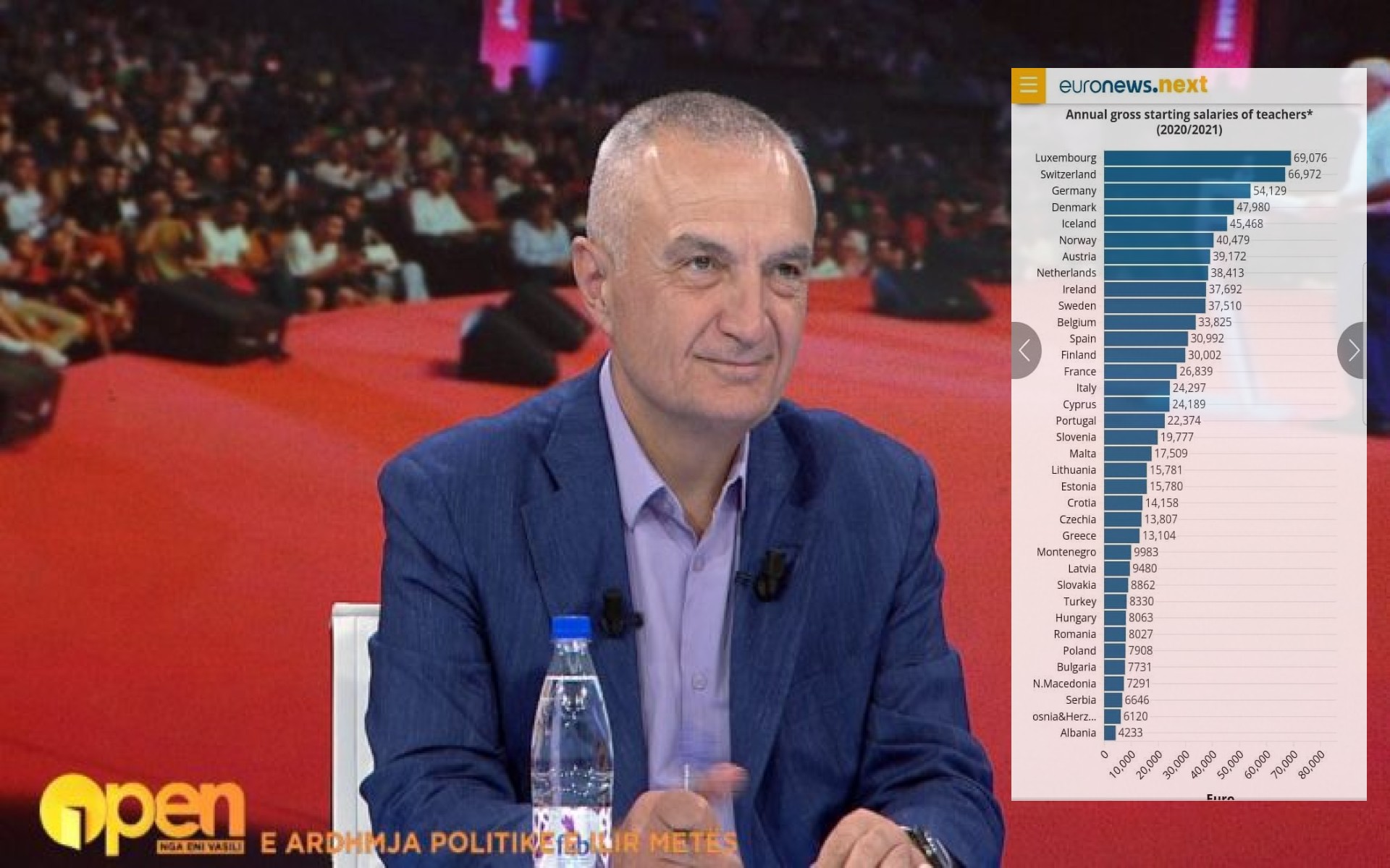 Kryetari i Partisë së Lirisë, Ilir Meta ka shpërndarë të dhënat e përpiluara nga “Euronews” mbi pagat e arsimtarëve në rajon dhe kontinent ku Shqipëria renditet e fundit.